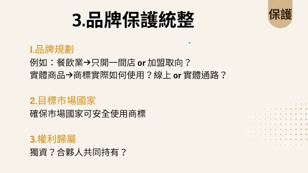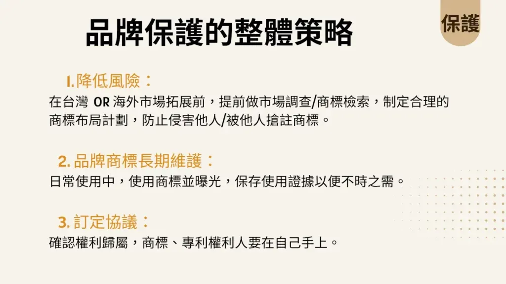 - 投資者:VC 與法人投資者會檢視品牌是否有IP保護基礎。