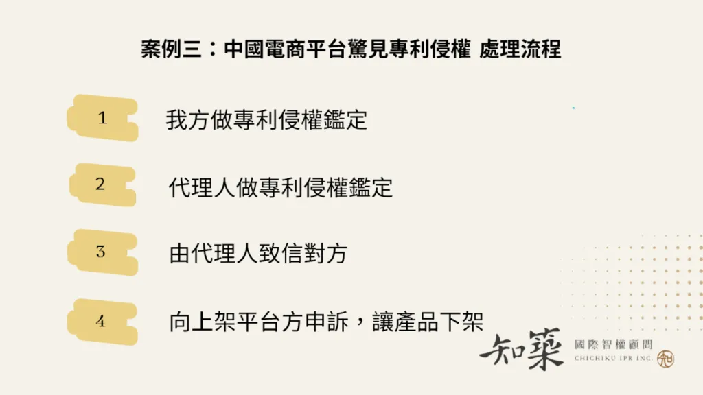 以中國電商侵權案為例,不只要熟悉中國專利法,也要理解當地平台的申訴方式與眉角。是否直接提告、還是用申訴程序解決,都會牽涉到時效、成本與風險評估。